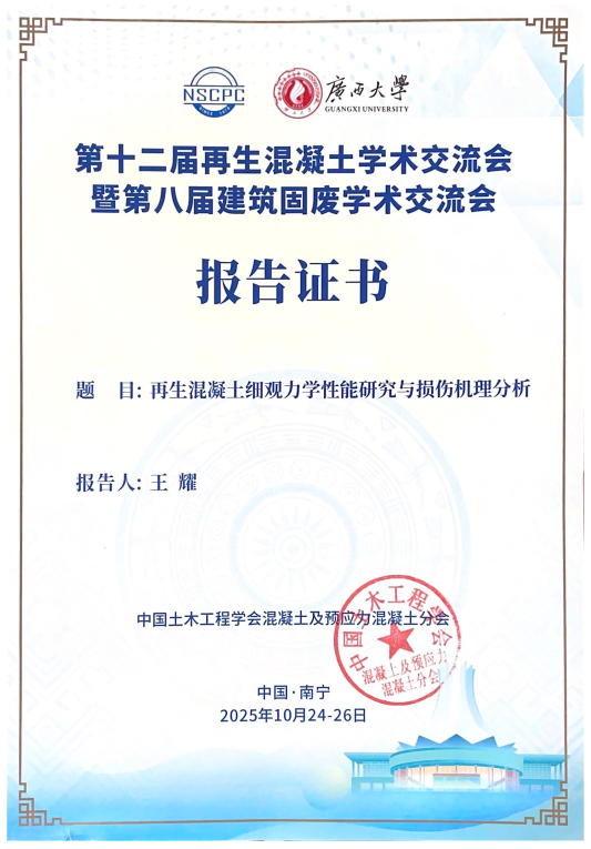 报告中,王耀系统介绍了学校在再生混凝土细观结构表征、力学行为模拟以及损伤演化机理等方面取得的重要研究进展。此次参会展示了学校在土木工程材料与绿色建筑领域的研究成果,进一步加强了与国内同行的学术交流与合作。